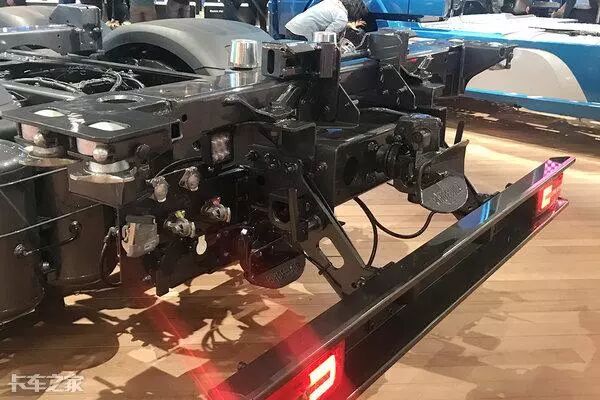 作为中置轴列车的主车底盘,不仅要承载本体货厢货物,还要牵引挂车货物,所以其车架强度不同于一般的单体载货车,我们也可以看到,该车采用了双层大梁,以及螺栓连接。