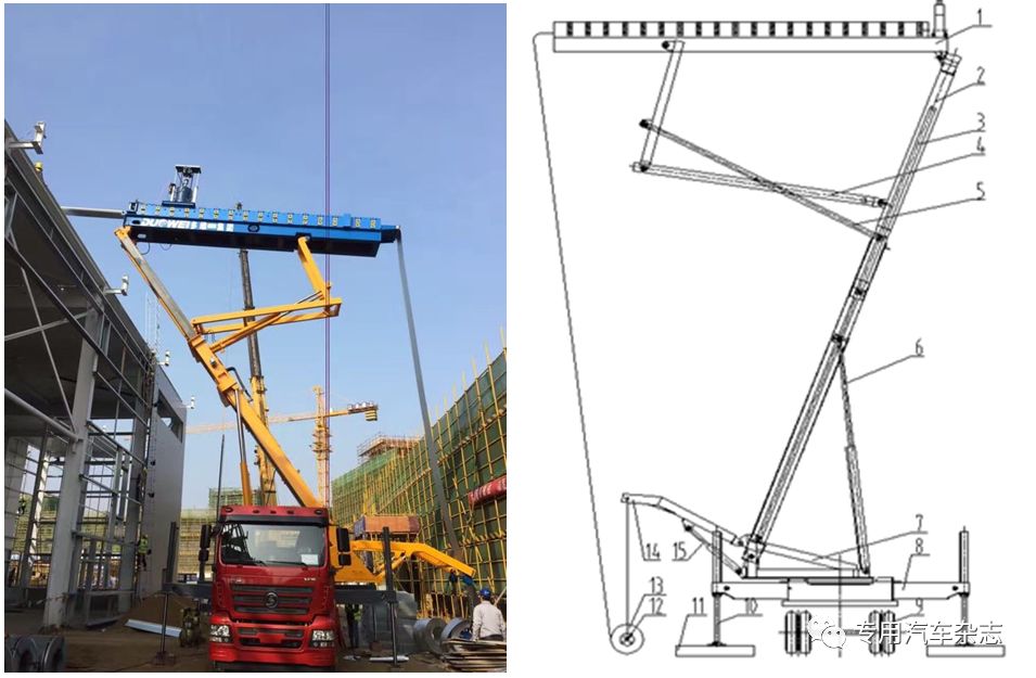 从右边的简图来看,该产品主要组成部分为:1.角驰式压瓦机 2.伸缩机构 3.伸缩油缸 4.五连杆平衡机构 5.平衡油缸6.变幅机构  7.回转机构  8.副车架  9.汽车底盘  10.垂直油缸11.枕木  12.放卷器  13.彩钢卷  14.放卷机构  15.放卷油缸